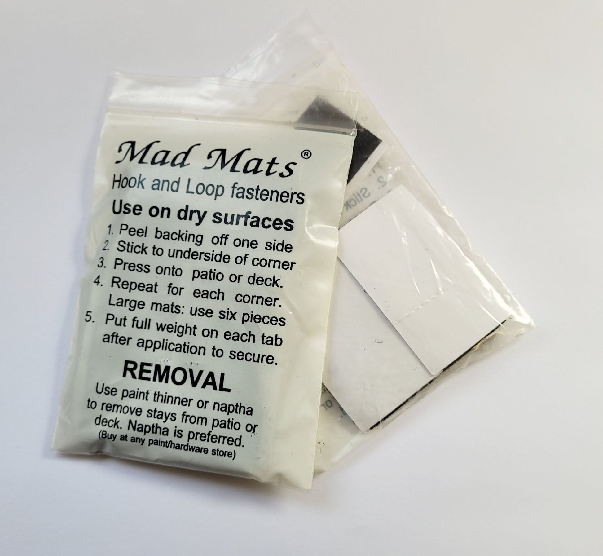 Our Indoor/Outdoor Corner Stays will help your mat lay flat. They are made with a hook and loop system, with each bag consisting of 6 pieces which is recommended for a single mat.