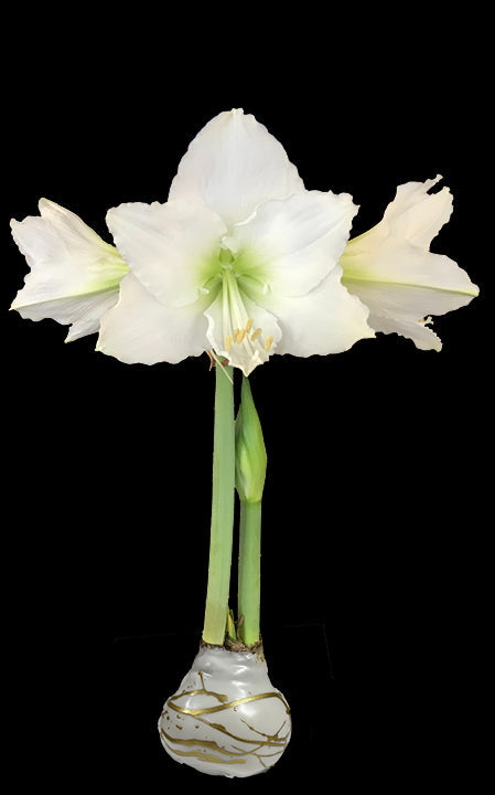 White Flower White Wax Gold Lacquer Splatter Base 36+ Keep 59-77 degrees F (15-25 degrees C), No watering Necessary, in case of wax or glitter coating, do not leave the bulb in direct sunlight or near heat to avoid melting. After blooming, the coating can be removed, and the bulb can be composted or planted. In case of wax or glitter coating, cracks may appear from the growth of the stalk while blooming. Not edible.